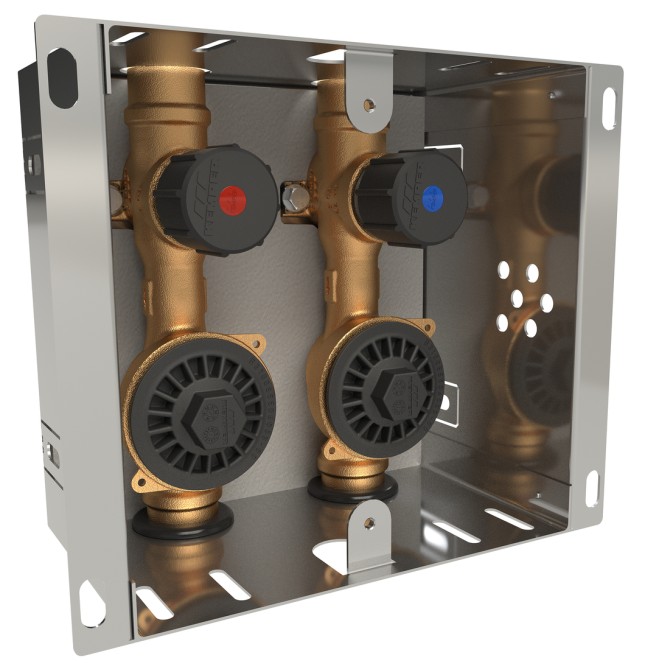- mit zwei fest integrierten, einteilig gegossenen, verdrehsicheren und schallentkoppelten Absperr-Wasserzähler-Kombinationen